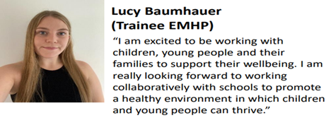 We are fortunate to have the Emotional Wellbeing Team in school. Rebekah, Lucy and Ricardo are in school weekly and offer 1:1 strategy-based CBT for low mood and wellbeing. As well as, group workshops, year group assemblies and family centered support.